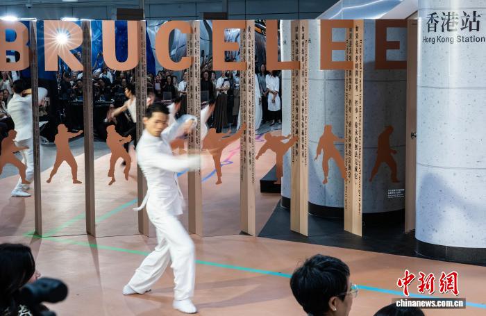 图为一名密斯正在港铁中环站内乱的特铺地区内乱仿照海报上李小龙的行动。记者 侯宇 摄